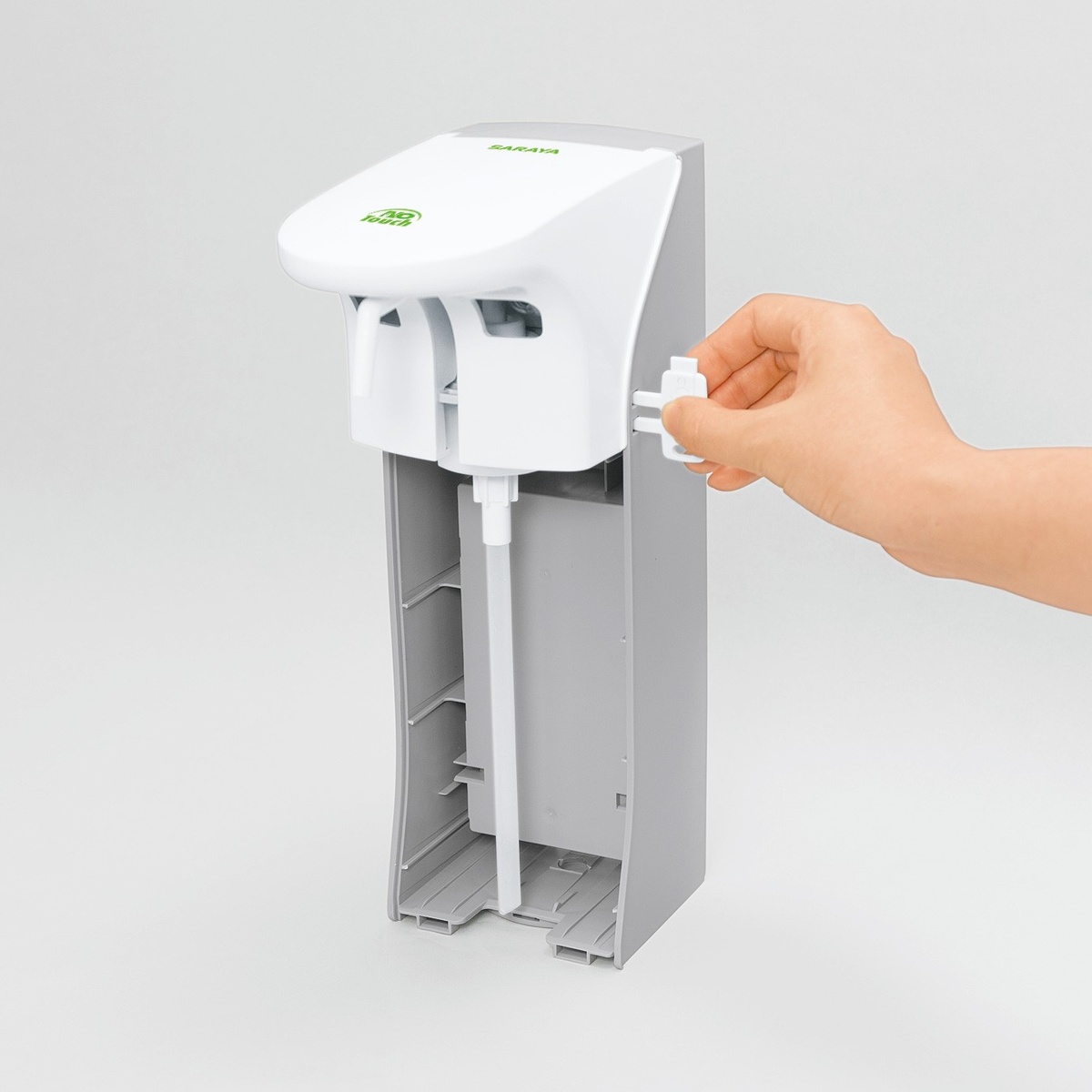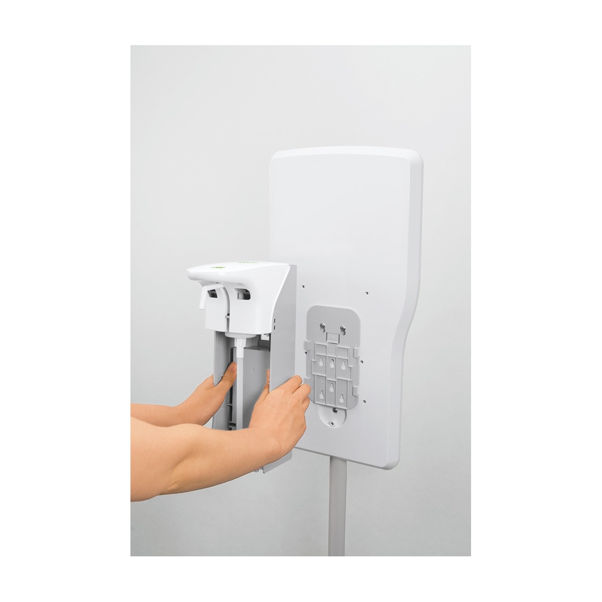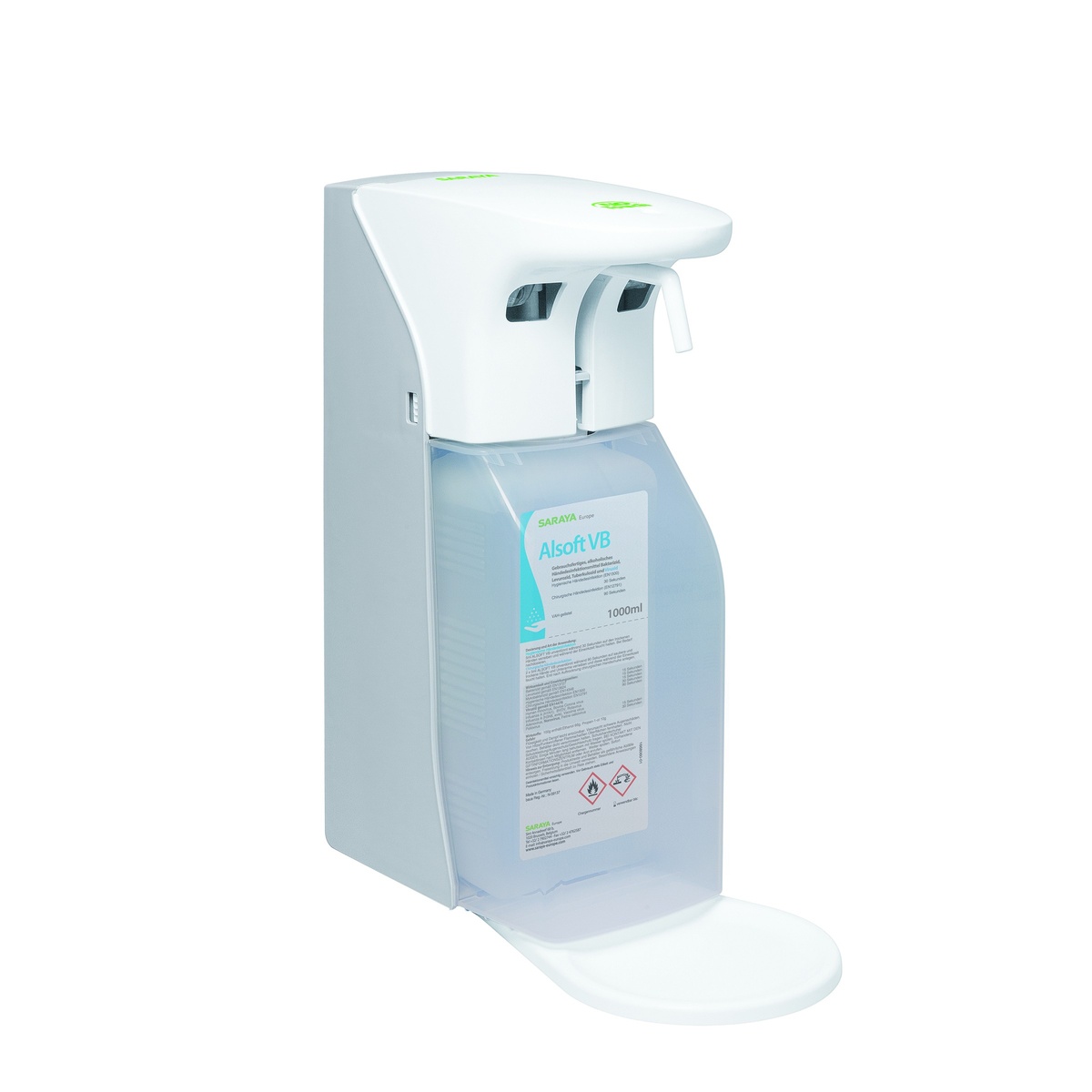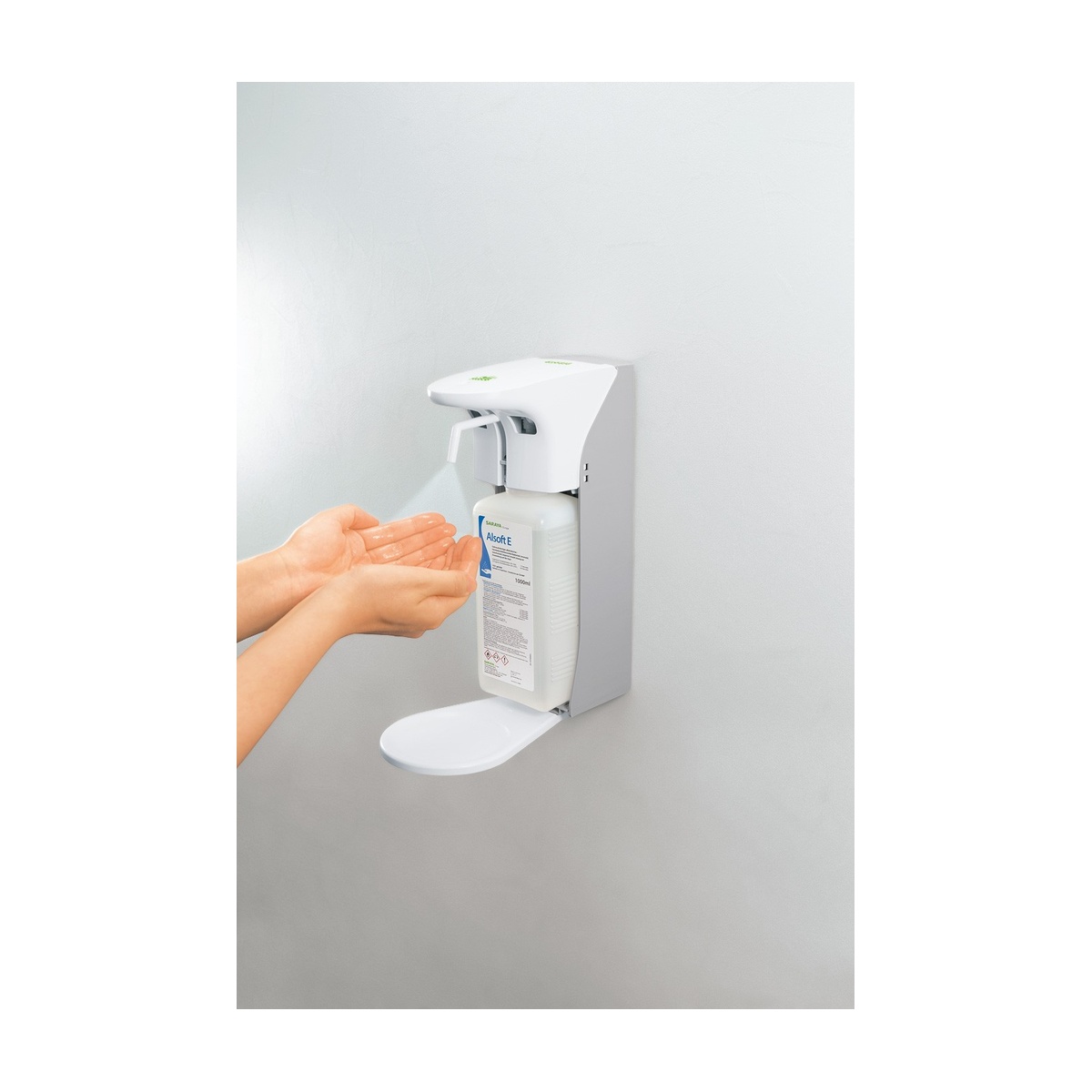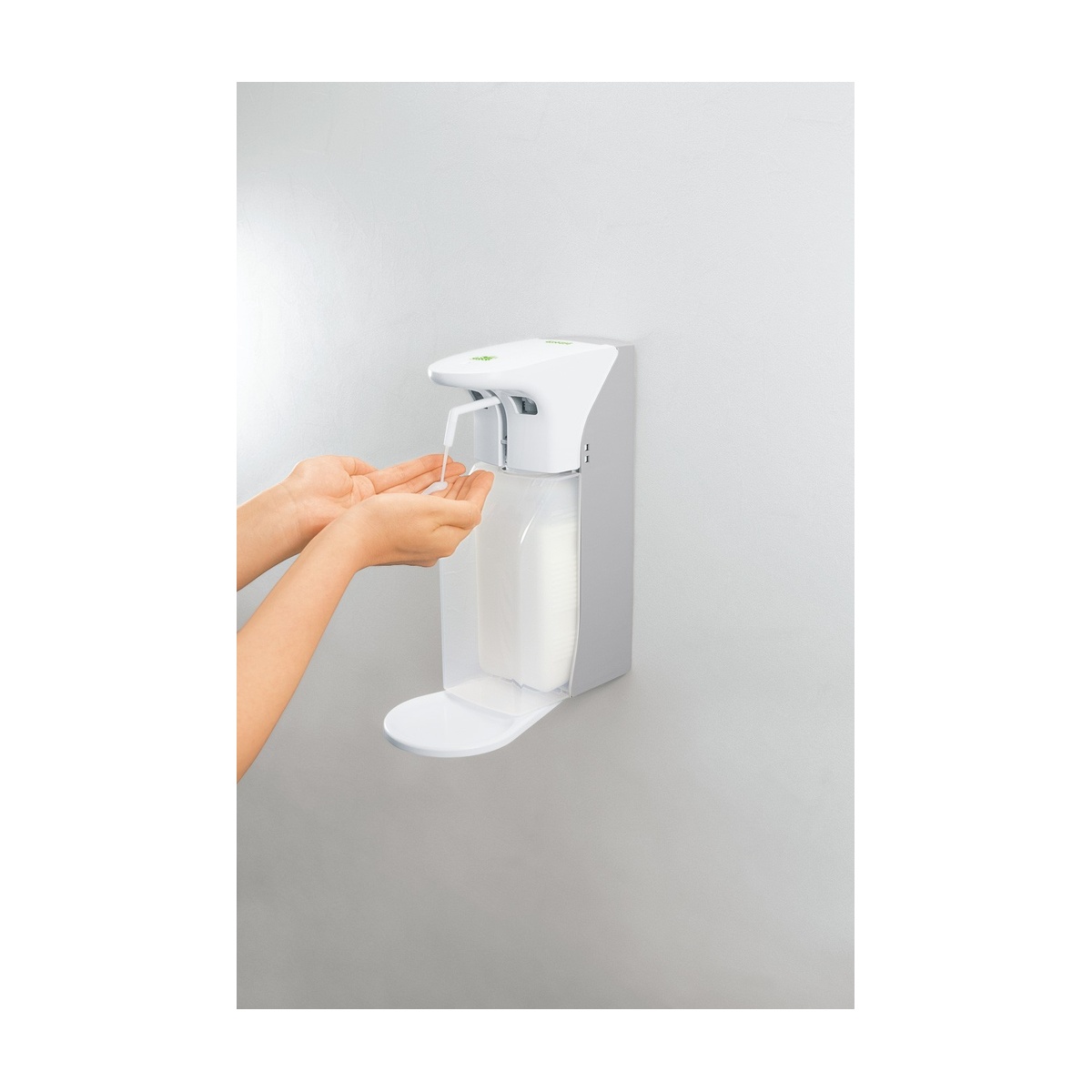 Bezdotykowy dozownik medyczny ADS 500/1000 zawiera tackę ochroną przeciw chlapaniu ścian, pompę oraz kluczyk. Jest urządzeniem higienicznym z wymienną pompką i wkładami 500 ml lub 1000 ml.