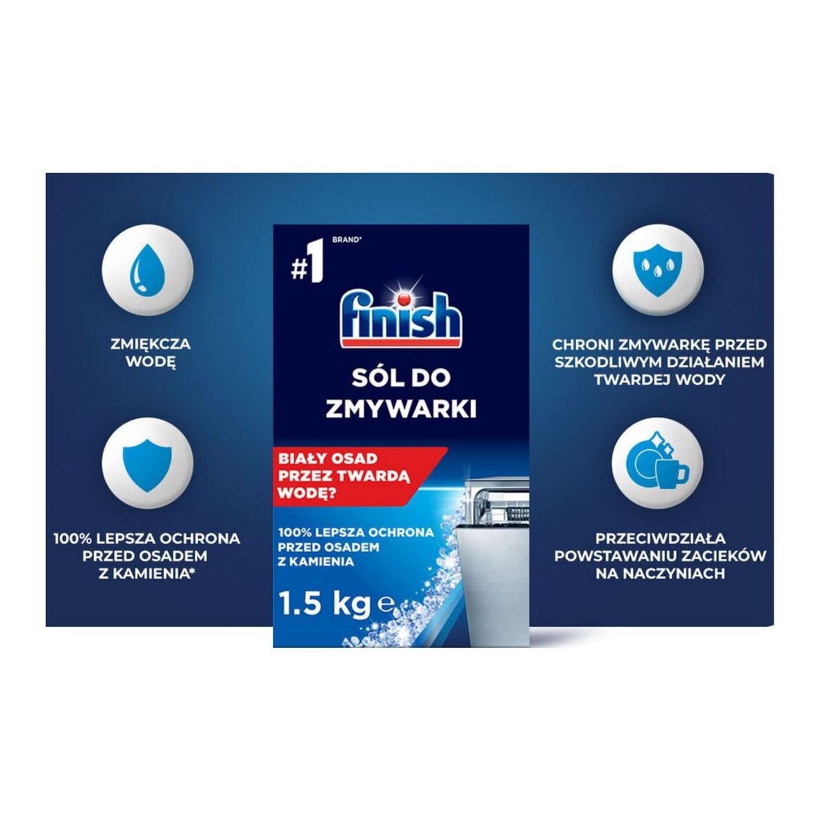 Finish Sól Ochronna do Zmywarki 1,5 kg; ochrona przed kamieniem; zmiękczanie wody; ochrona filtrów i spryskiwaczy; poprawienie działania zmywarki; usuwanie zacieków
