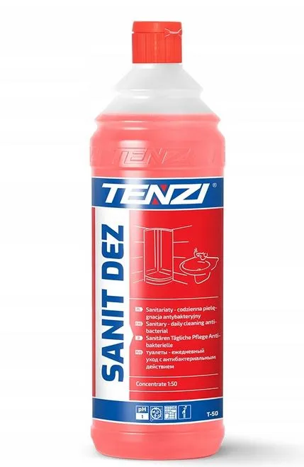 Tenzi Sanit Dez to zawierający kwas mlekowy, antybakteryjny preparat do mycia i dezynfekcji sanitariatów. Bezpieczny dla wszystkich powierzchni chromowanych, niklowanych, emaliowanych czy akrylowych. Jednocześnie myje, dezynfekuje i nadaje połysk. Skutecznie usuwa bieżące zanieczyszczenia pochodzenia nieorganicznego. Wykazuje działanie bakteriobójcze zgodnie z normami: PN-EN 1276 oraz PN-EN 13697. Pozwolenie na obrót produktem biobójczym: 4877/12.