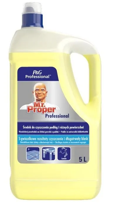 Mr. Proper to produkt do szybkiego i łatwego mycia podłóg i dużych powierzchni. Nadaje się do szerokiej gamy materiałów powierzchniowych, w tym lakierowanego drewna i laminatu. Polecany do użytku profesjonalnego. Nie stosować na porowatych powierzchniach. Unikaj długotrwałego kontaktu ze stalą nierdzewną, marmurem, aluminium, tworzywem sztucznym oraz powierzchniami malowanymi i malowanymi. W razie wątpliwości spróbuj w mniej widocznym miejscu. Pojemność 5 l.