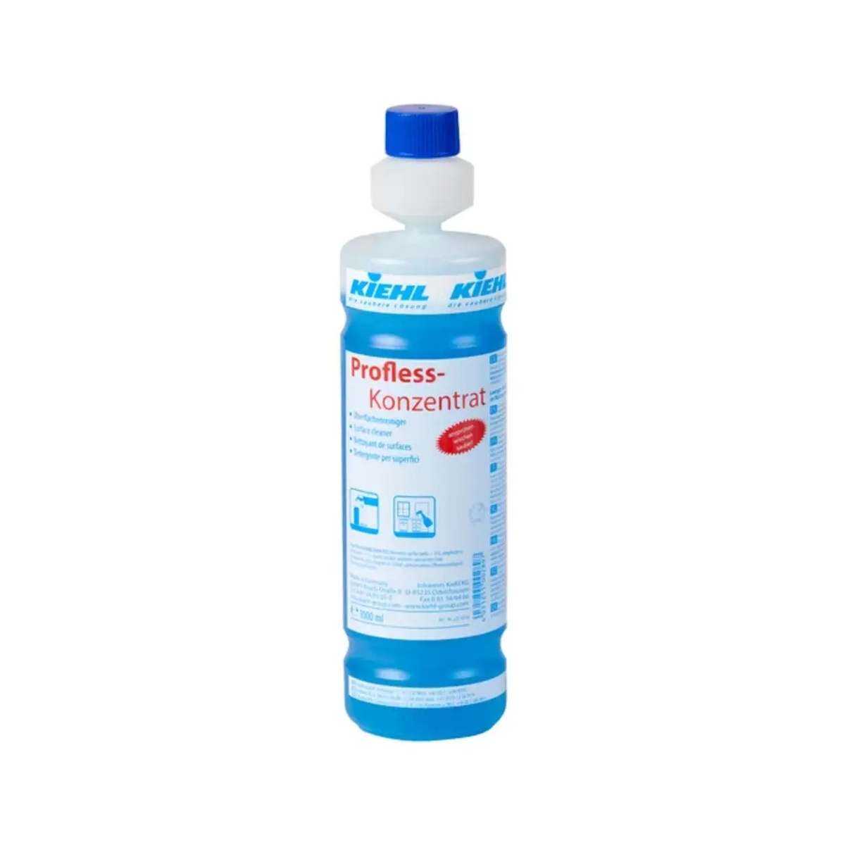 Kiehl Profless-Konzentrat jest wolny od agresywnych substancji i dlatego nadaje się do szybkiego i ekonomicznego mycia wszystkich wodoodpornych powierzchni w procesie codziennego mycia bieżącego. Roztwór roboczy Proflessu stosowany w procesie mycia metodą spray (wolną od aerozoli) szybko rozpuszcza brud i jest przyjazny dla czyszczonego materiału i skóry rąk. Roztwór roboczy Proflessu można przygotować za pomocą butelki dozującej z koncentratem lub dozowników KIEHLA: DosiExpress i DosiJet.