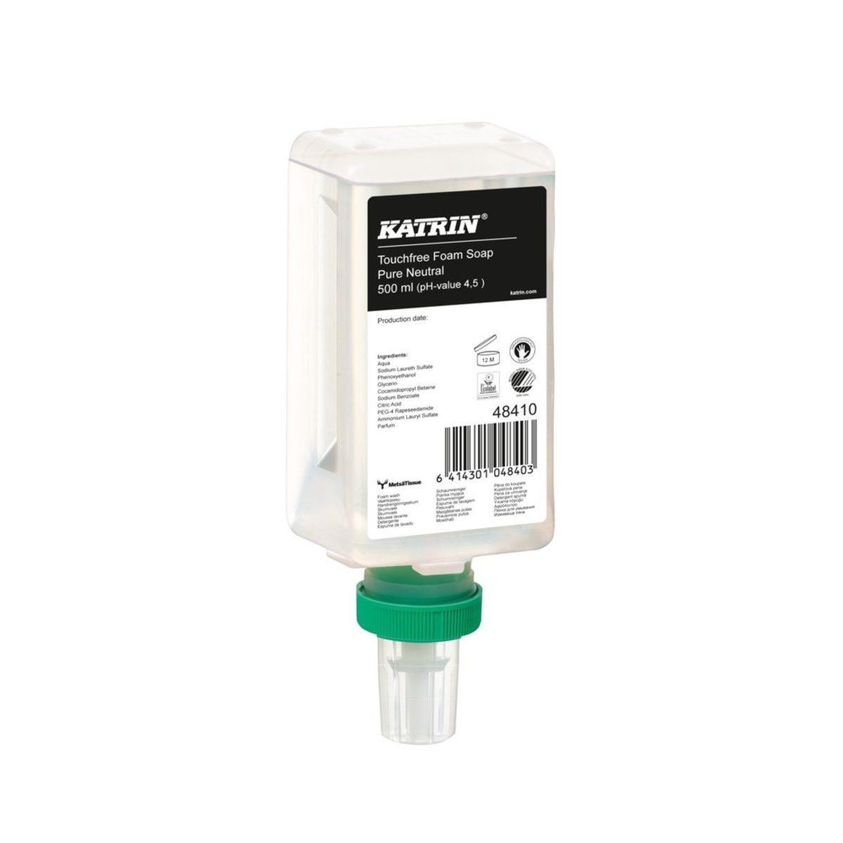 Katrin Touchfree Foam Soap 500 ml Pure Neutral jest wydajnym oraz łagodnym dla skóry mydłem w pianie o przyjemnym, neutralnym zapachu. Posiada certyfikaty jakości Nordic Swan Eco-label oraz Ecolabel European Flower. Wkłady idealnie pasują do dozowników z bezdotykowym system Katrin Touchfree.