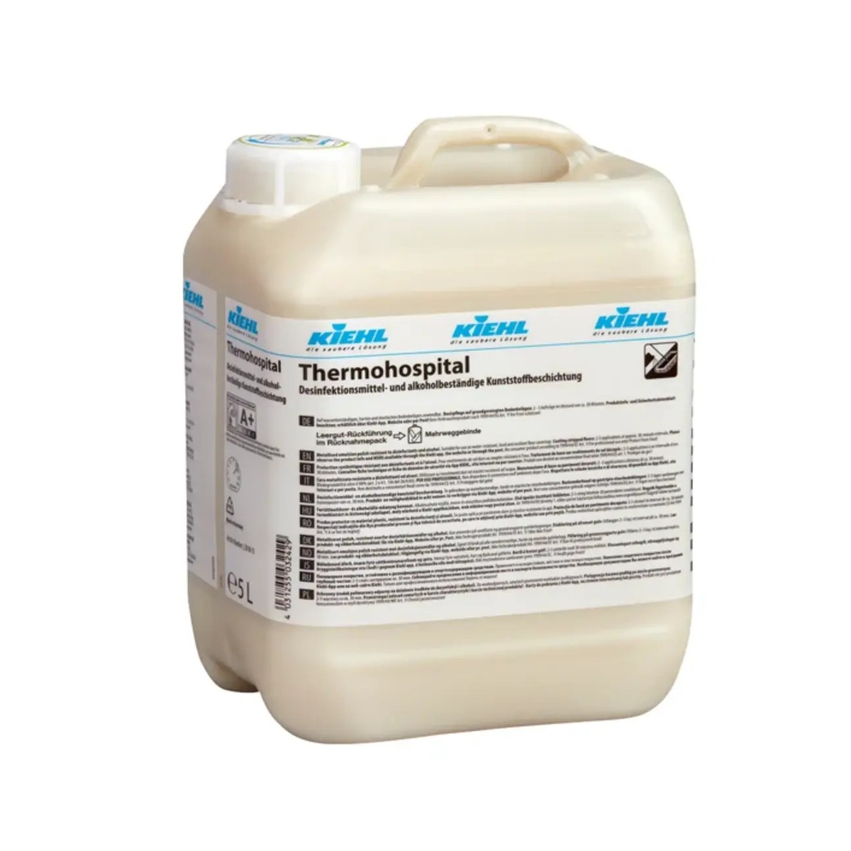 Kiehl Thermohospital to dyspersja tworzywa sztucznego odporna na działanie środków do dezynfekcji i alkoholi przeznaczona do ochrony podłóg w obszarach, w których często używane są środki do dezynfekcji rąk i powierzchni. Thermohospital to wysokojakościowa pielęgnacja bazowa szczególnie wytrzymała na ścieranie, odpierająca brud, odporna na zmywanie, antypoślizgowa. Środki do dezynfekcji rąk mogą powodować chwilowe rozpuszczenie filmu pielęgnacyjnego, ale tylko w rzadkich przypadkach tworzą uporczywe plamy.