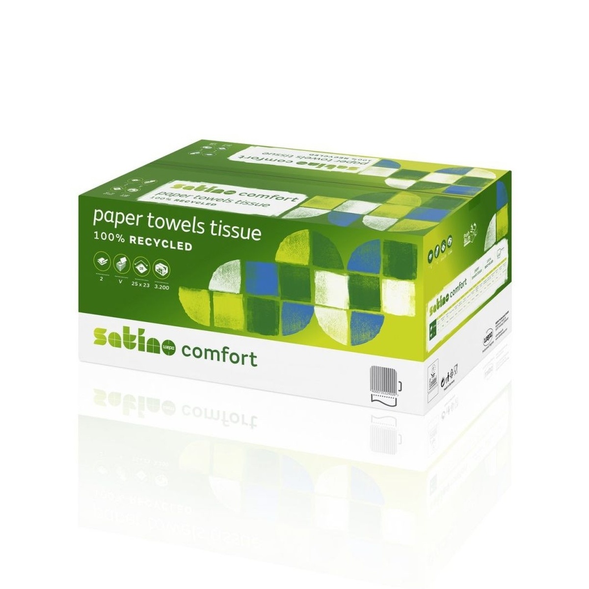 Śnieżnobiały ręcznik składany w układzie V, wykonany z makulatury.