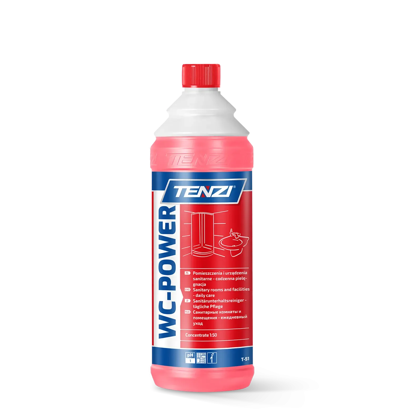 Tenzi WC Power to środek przeznaczony do doczyszczania, dezynfekcji oraz bieżącego mycia powierzchni i urządzeń sanitarnych. Jest to kwaśny płyn myjąco-czyszczący o antybakteryjnym działaniu, który idealnie usuwa bieżący brud pochodzenia mineralnego (kamień wapienny, brud, złogi mydeł, przebarwienia w postaci rdzy, nacieki urynowe). Preparat pozostawia charakterystyczny, antyseptyczny zapach. Bezpieczny dla wszystkich powierzchni odpornych na działanie kwasów. Wykazuje działanie bakteriobójcze zgodnie z normami: PN-EN 1276 oraz PN-EN 13697.
