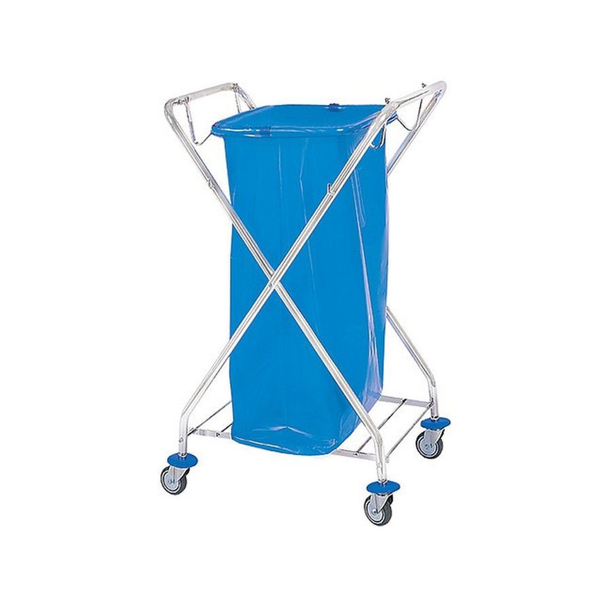 Funkcjonalny wózek na odpady, który składa się z: wózka na kółkach o chromowanej konstrukcji, worka o pojemności 120 litrów w niebieskim kolorze. Znacząco usprawni sprzątanie dużych powierzchni biurowych, hotelowych, szpitalnych.
