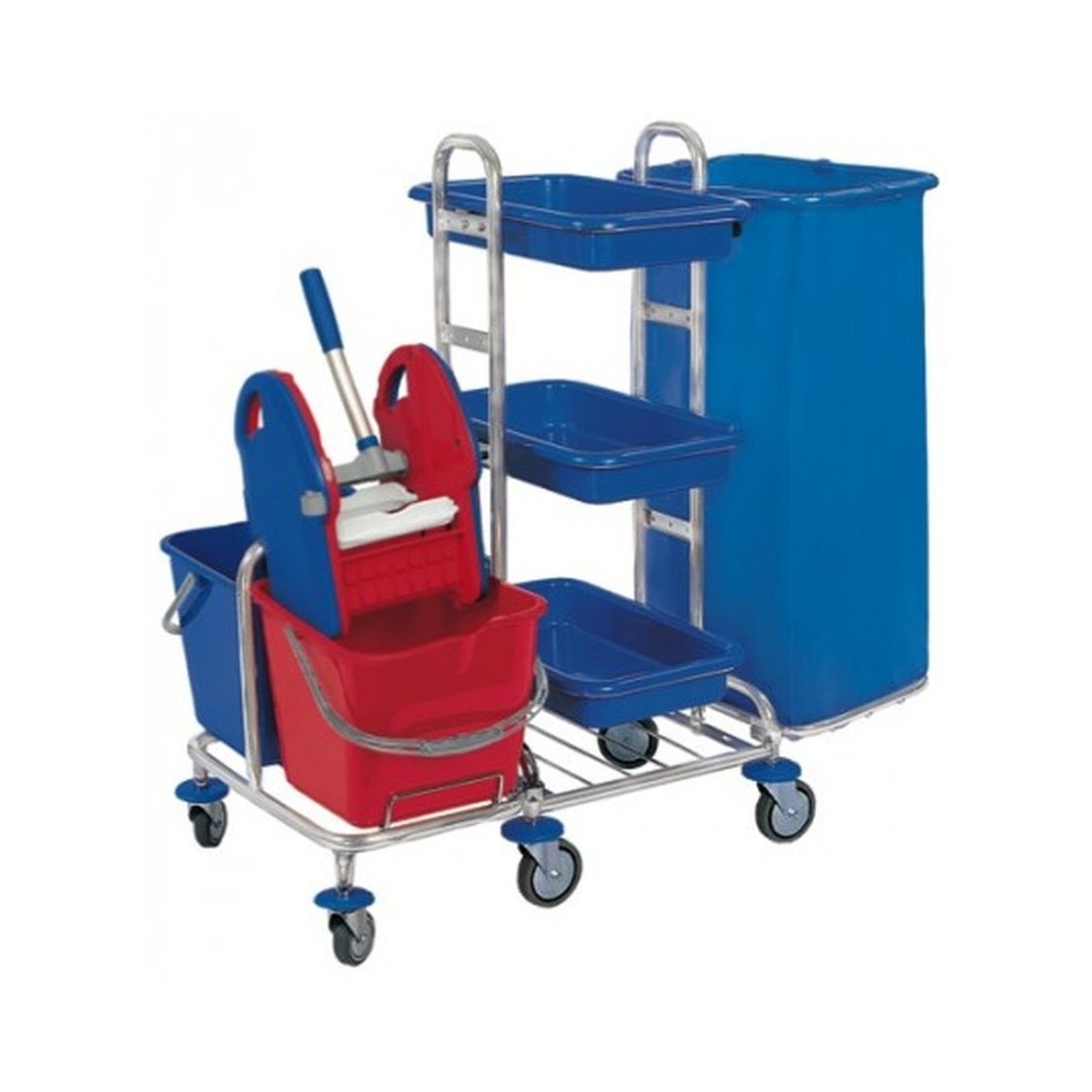 Bardzo funkcjonalny zestaw sprzątający firmy Splast z konstrukcją chromowaną, wyposażony w dwa wiadra o pojemności 20 litrów w kolorach czerwonym i niebieskim oraz w prasę do wyciskania mopa w tym samym kolorze z trzema niebieskimi kuwetami wraz ze 120 litrowym niebieskim workiem na śmieci. Wózek ten znacząco ułatwi czyszczenie dużych powierzchni w biurach i hotelach.